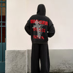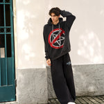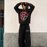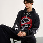 Unleash your inner rebel with the Rebel Flame Hoodie, a bold statement piece designed for the fearless. Crafted from a premium cotton blend, this oversized black hoodie features a striking front graphic with a red and white pentagram crossed out, accented by fiery flame details and subtle skullcap embroidery. The relaxed fit and drawstring hood offer ultimate comfort, while the edgy design makes it perfect for standing out in any urban setting. Pair it with matching pants for a full streetwear vibe.