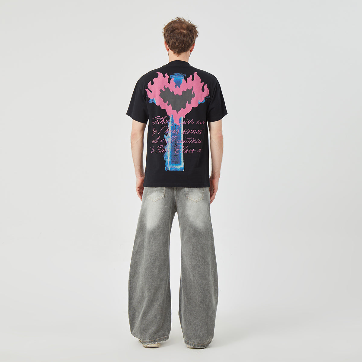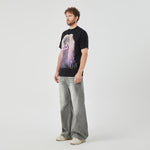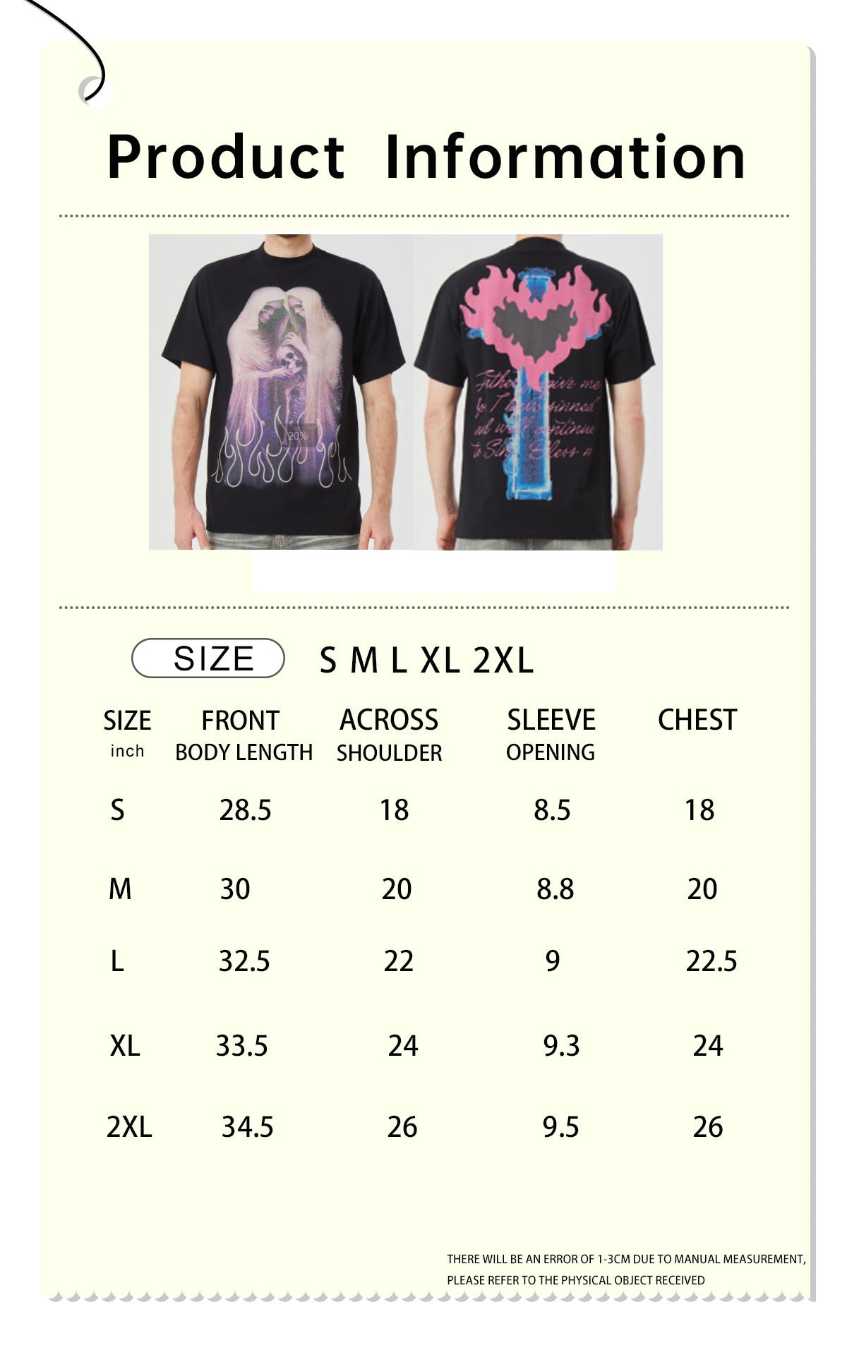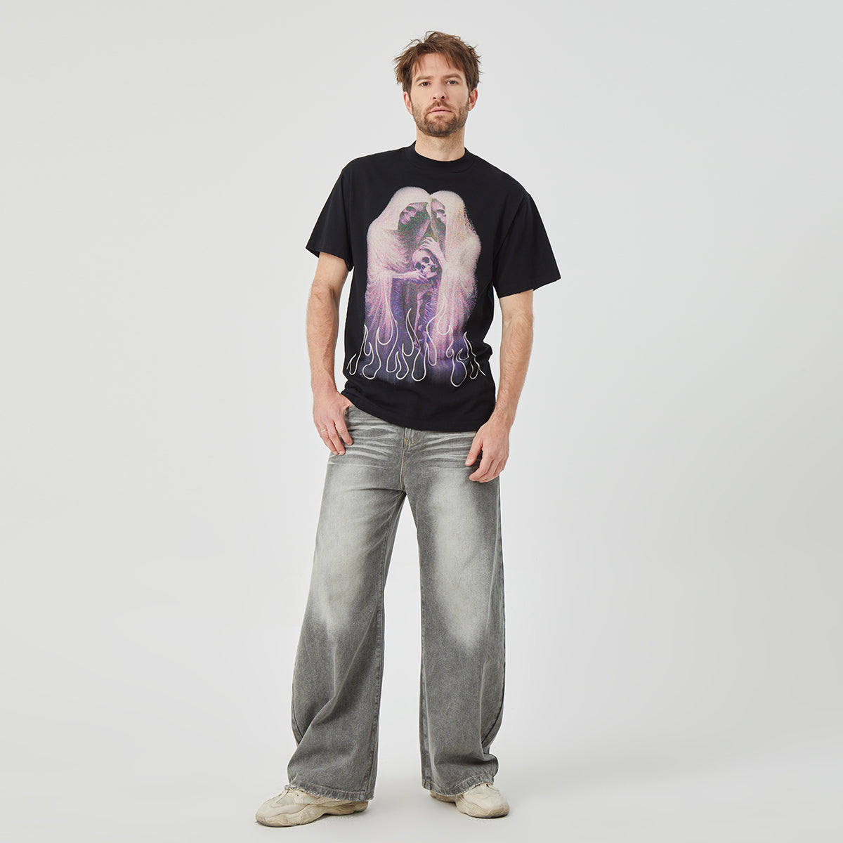 This black T-shirt showcases a striking graphic of ghostly figures,a skull, and flame-like motifs,adding an edgy and mysterious vibe to your casual look.