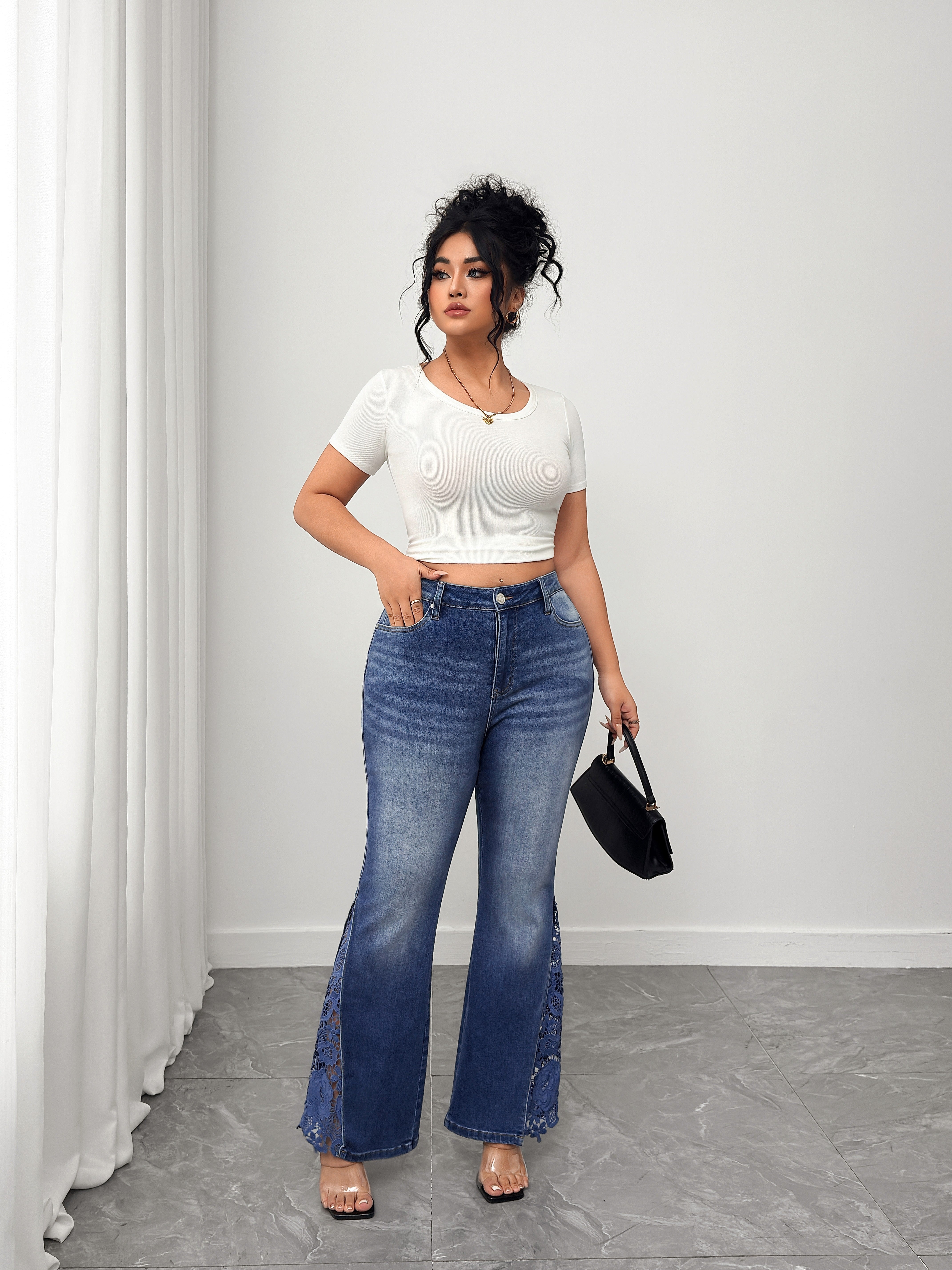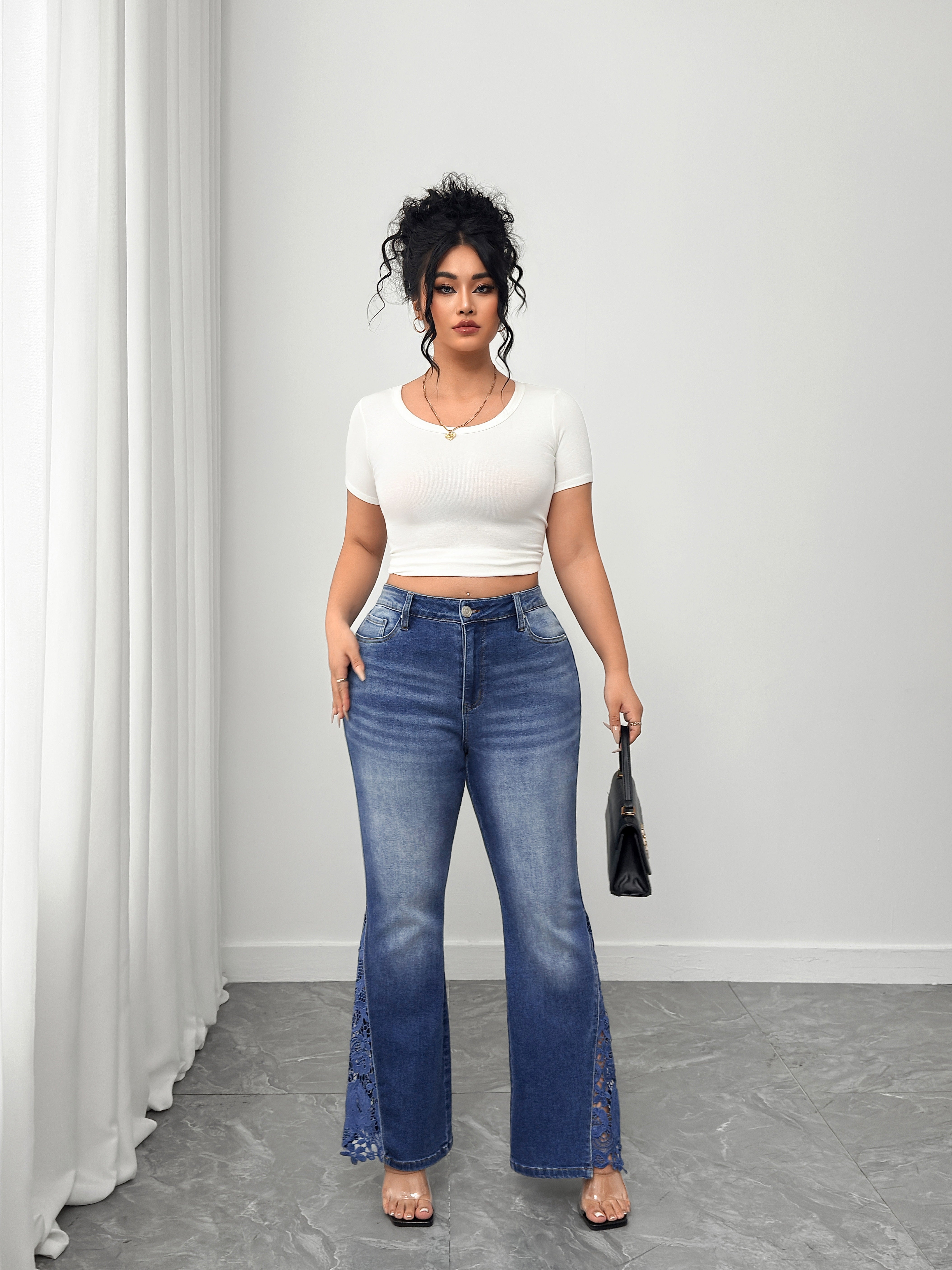 Elevate your denim collection with these Women's Plus High Waisted Flare Jeans featuring delicate lace side detailing. The high - rise waist delivers a figure - flattering fit, while the flare leg silhouette adds retro charm and elongates the leg line. Made from soft yet durable denim, the jeans are enhanced with beautiful lace panels along the sides, blending casual comfort with feminine elegance. Perfect for pairing with crop tops (as styled), bodysuits, or blouses, they seamlessly transition from daytime errands to evening plans. Whether styled with heels for a dressier vibe or flats for laid - back ease, these jeans bring a unique, stylish twist to any look.